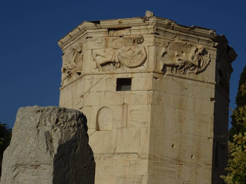 Roman Agora (Romeins Forum): Toen de Romeinen het Griekse Ancient Agora vierlieten stichtten ze een nieuw centrum, het Romeins forum,met als absolute blikvanger de achtkantige "Toren der winden",(50 v. Chr). De toren bevat een wateruurwerk dat werkt op een beek komend vanaf de Akropolis.