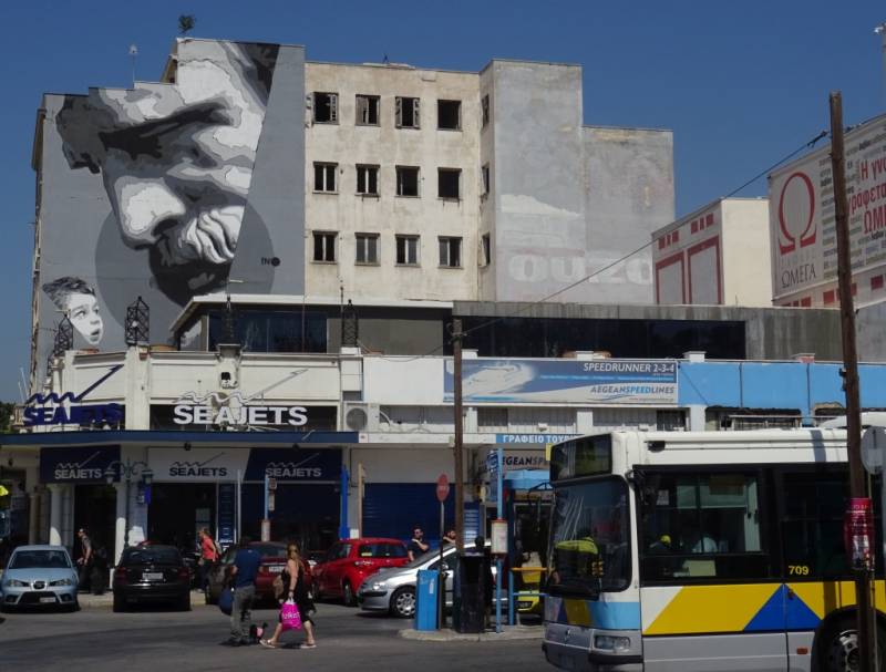 Met de metro reizen we 6 km richting het zuidwesten. Daar komen we in de havenstad Piraeus. Bij het verlaten van het metrostation merk je dezelfde hectiek als in Athene: op diverse kruispunten driftig door elkaar fluitende politie-agenten, waar zeer slecht door de chauffeurs op gereageerd wordt.