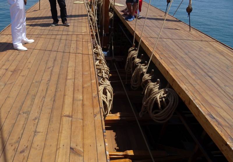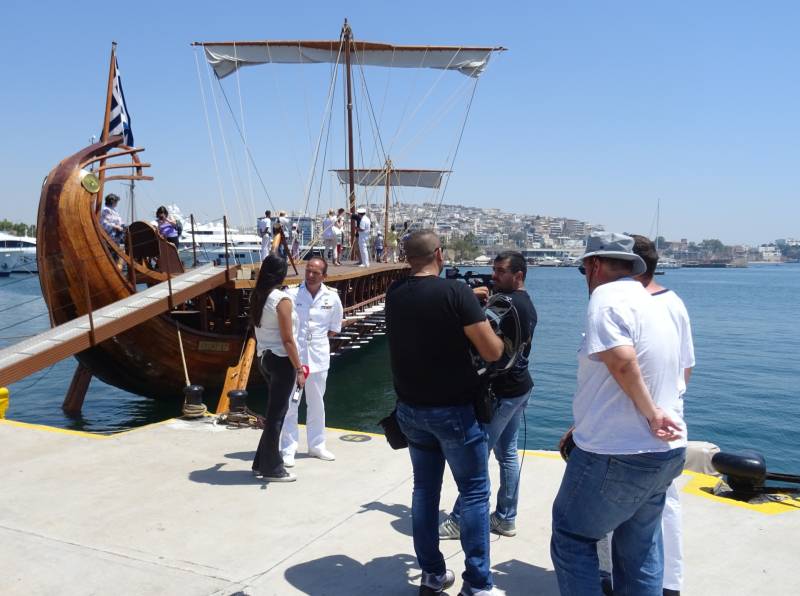 in de haven van Piraeus lag deze dagen een replica van een oude Romeinse roeiboot.