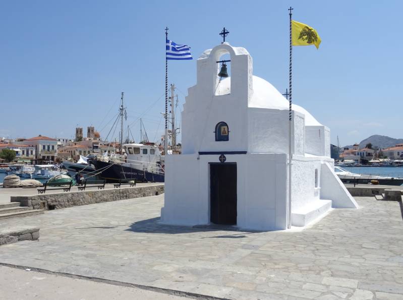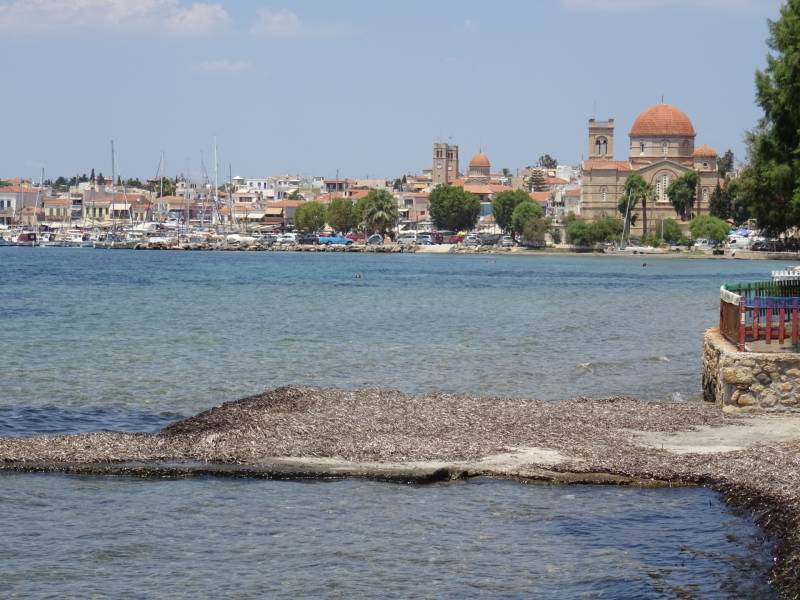 Het eilandje Aegina is één van de mooiere eilandjes in dit gebied. Het telt dan ook diverse B&B-adressen. Je komt er vooral voor het strand en om te watersporten of te wandelen. De kleine en smalle winkelstraatjes doen wel gezellig aan en uiteraard is het ook altijd fijn om op een terrasje wat te eten, te drinken en te kijken. Wij blijven maar enkele uurtjes in de gelijknamige hoofdstad Aegina. Bezienswaardigheden zijn o.m. de Sint-Nicolaaskerk en de Toren van Makkelos. Verder is het eiland bekend van de pistachenoten. Er zijn diverse grote(re) boomgaarden met pistachenootbomen: 3% van de wereldhandel in pistachenoten komt van dit kleine eilandje.