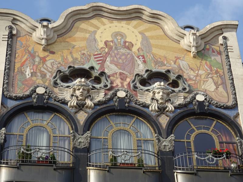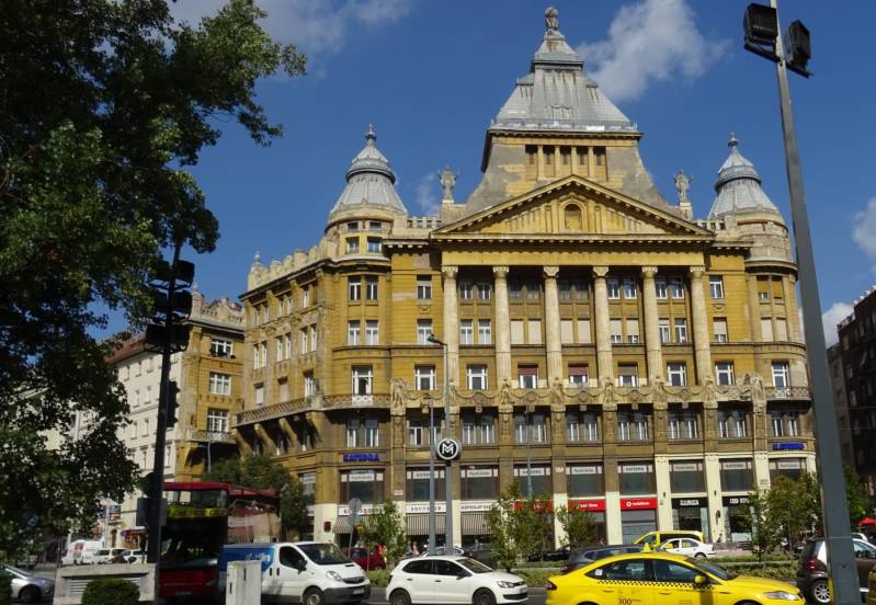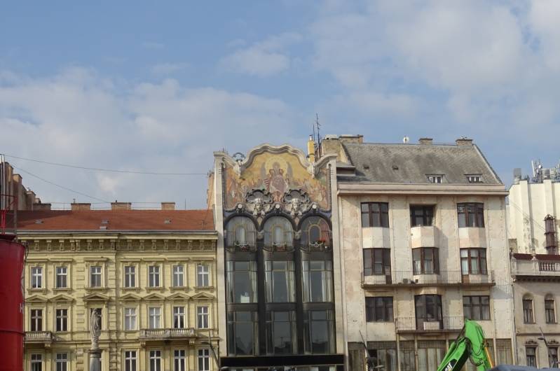 Aan de Vörösmarty tér kwam ik in een gevelrijtje nog een schitterend gebouw tegen. Het gebouw an-sich trok niet zo de aandacht. Wel de schitterende top in de gevel, hieron-der nog eens vergroot weergegeven. Wat een schoonheid!