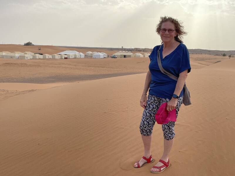Op de plaats van onze eindbestemming stonden de dromedarissen al klaar. Een aantal mensen uit onze groep besloten per dromedaris verder een stukje woestijn te verkennen. Wij gaven er de voorkeur aan om een stukje te voet door het Saharazand te banjeren: één stap vooruit, drie stappen terug...........Maar niettemin hebben we op deze manier toch ook een stukje Sahara gezien.