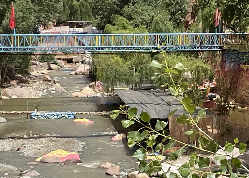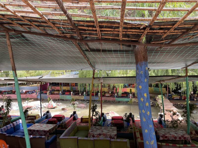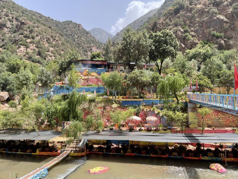 Aan het eind van deze weg door de Ourika Valley kan de bus niet meer verder. Daarom stappen we hier uit en gaan we lopend verder langs de Ourika-rivier. Langs deze rivier zijn diverse ondernemers horecagelegenheden gestart die er kleurrijk en zeer feestelijk uitzien.