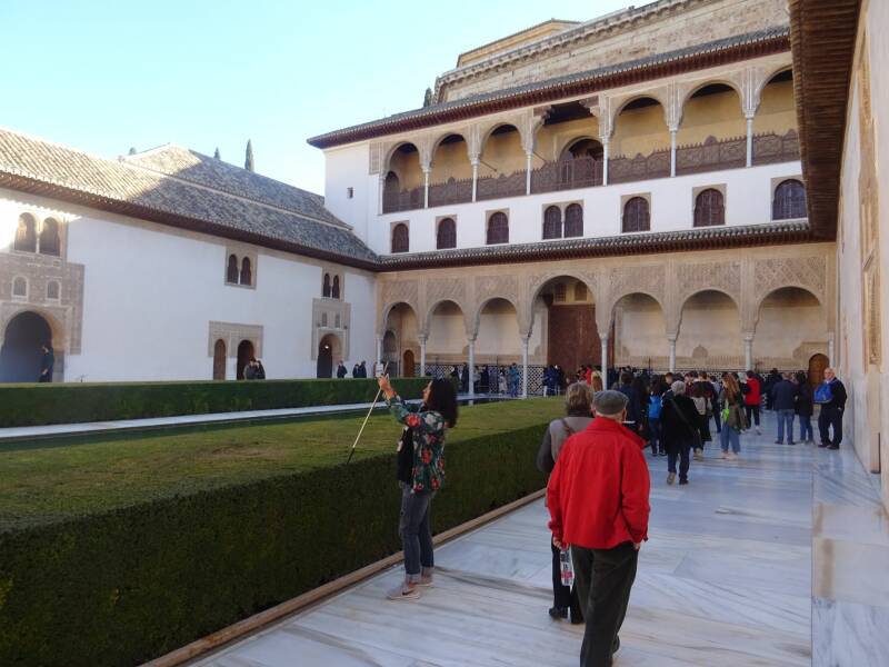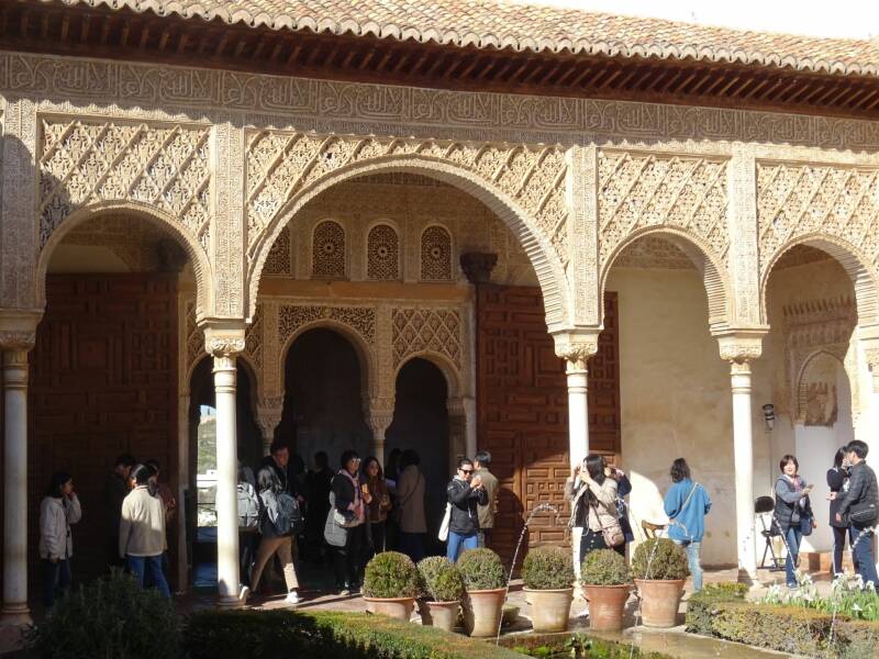 Dit gedeelte van de paleizen is wel het meest privé. Het paleis was zonder twijfel een harem. Dat blijkt uit de alkoven die de binnenplaats omringen. Alkoven zonder ramen. Het binnenplein wordt omsloten door 124 marmeren pilaren die symbool staan voor palmbomen. Zo moeten we het idee krijgen dat we in het paradijs zijn. Midden op het plein staat de leeuwen-fontein: een groot waterbasin (de zee) gedragen door 12 leeuwen, vermoedelijk symboliserend: de 12 stammen van Israël.