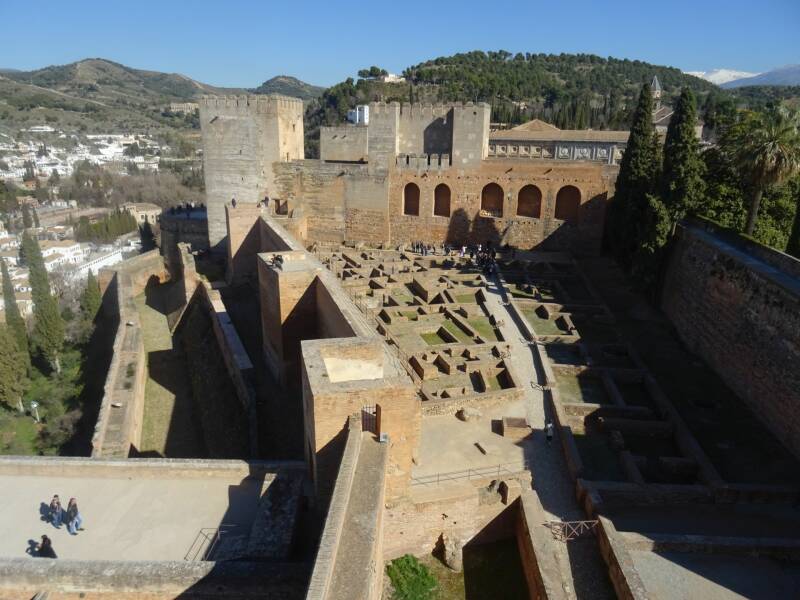 2) Het Alcazaba: de militaire ruimtes, met uitkijktorens, woon- en slaapvertrekken etc.