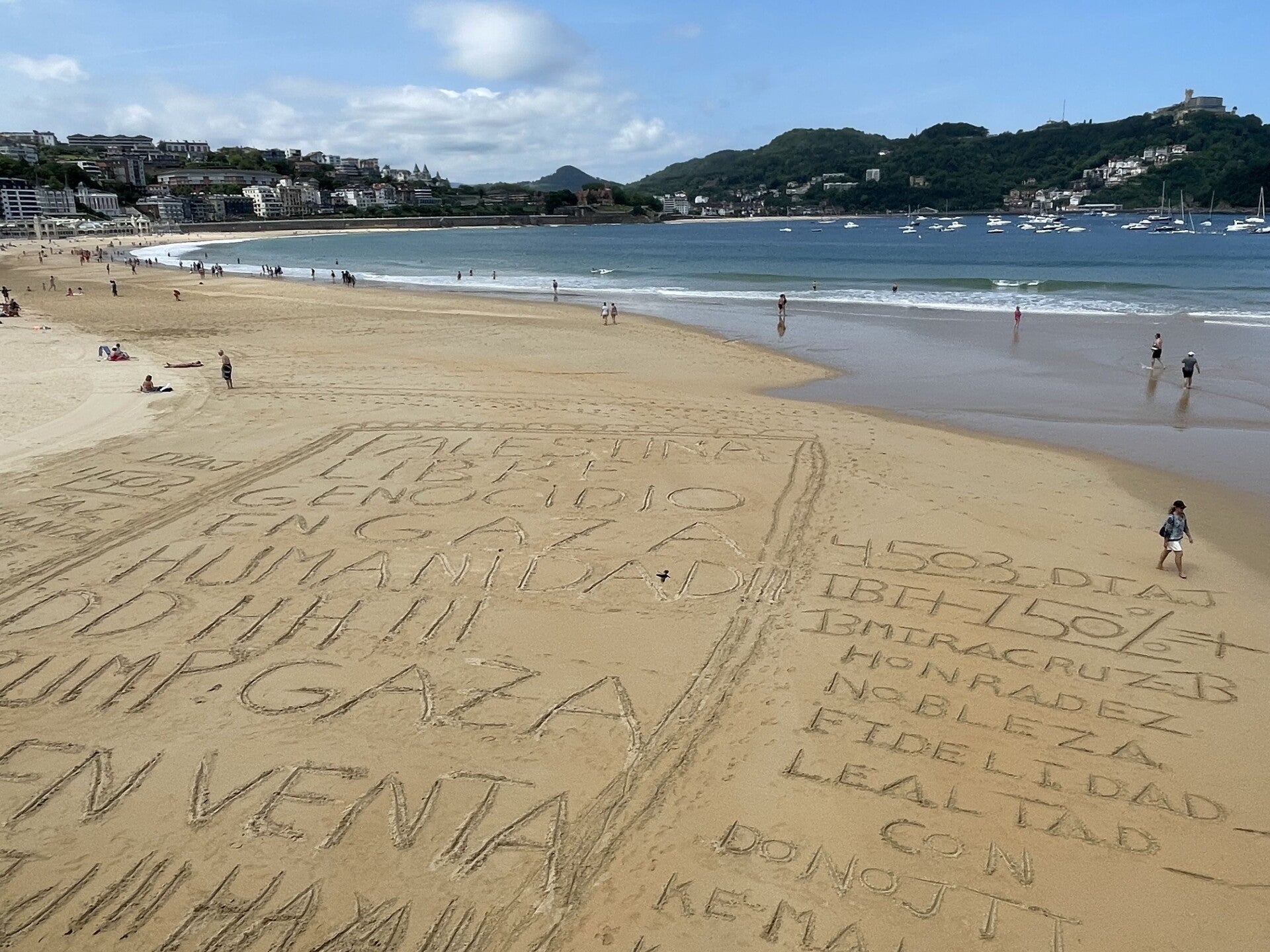 het prachtige strand liet zich ook gebruiken als groot protestbord, in dit geval i.v.m. Gaza.